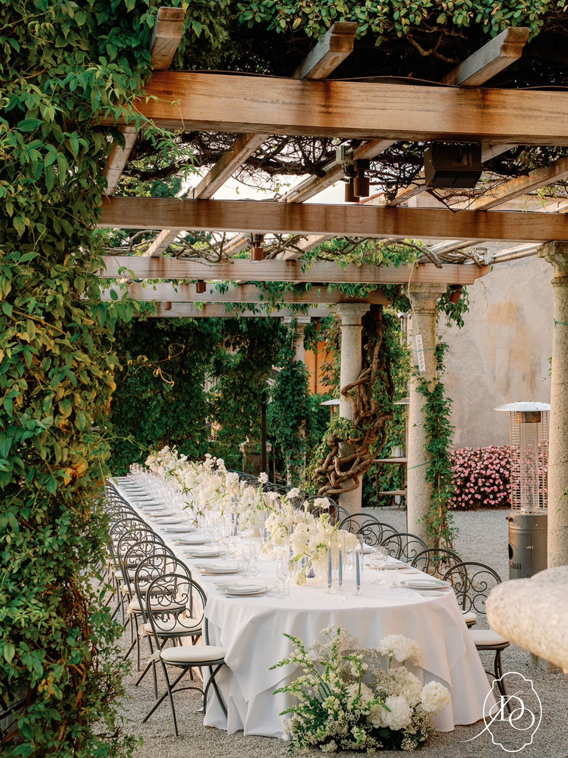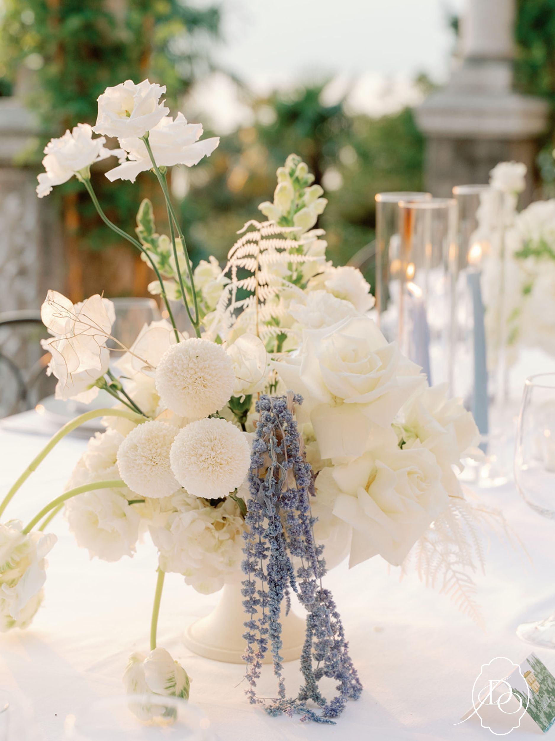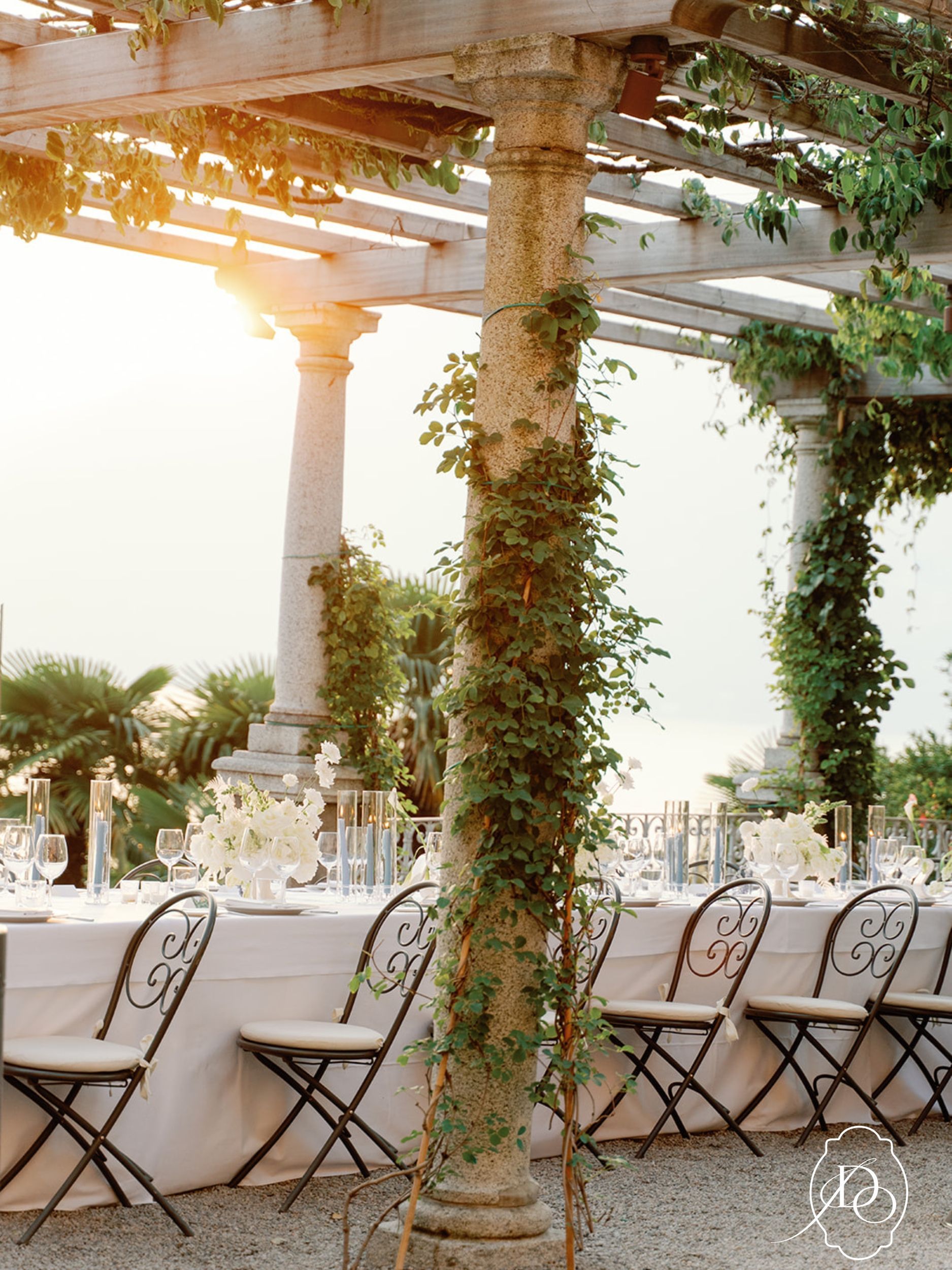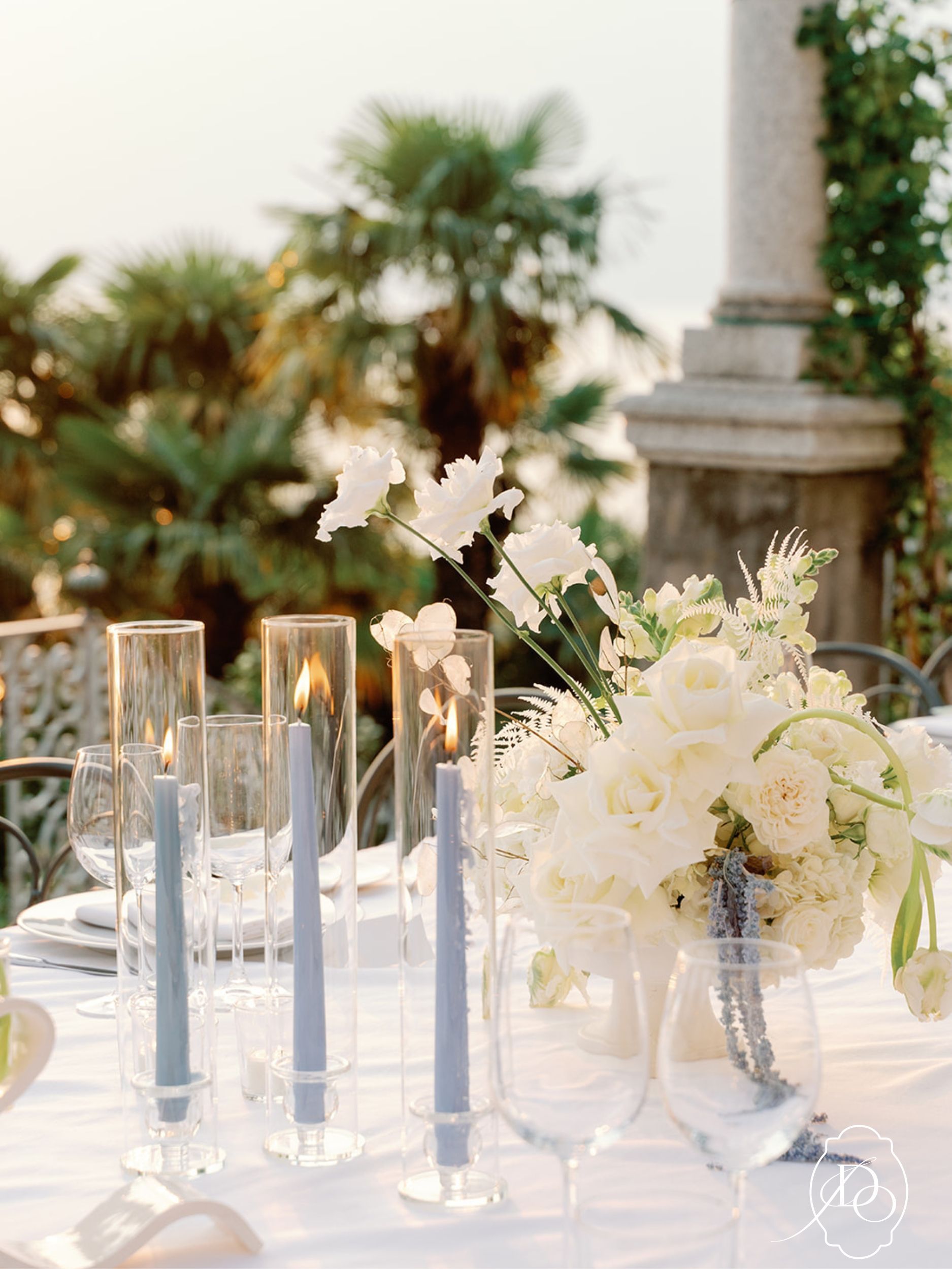 The reception followed on the enchanting outdoor terrace of Villa Cipressi, surrounded by greenery with a stunning view of the sunset over the lake. The refined and elegant decor was composed of delicate white flowers and crystal chandeliers with light blue candles. To the smooth sounds of a saxophone, guests enjoyed a refined dinner before joining the dance floor for a night of joy and fun.