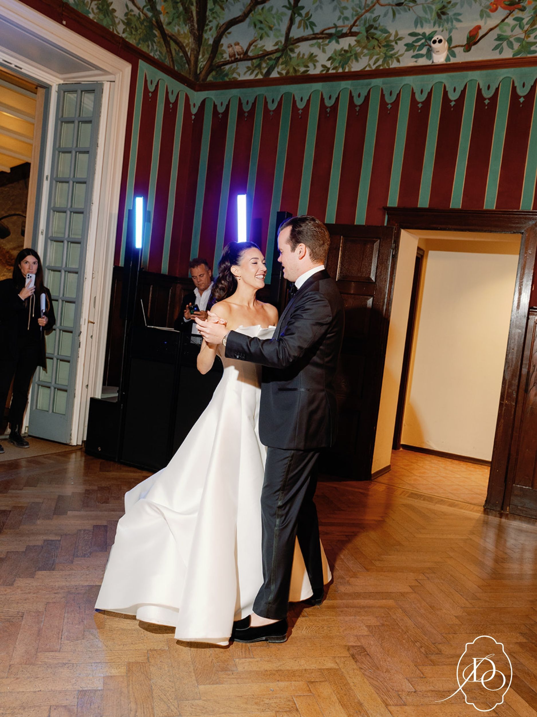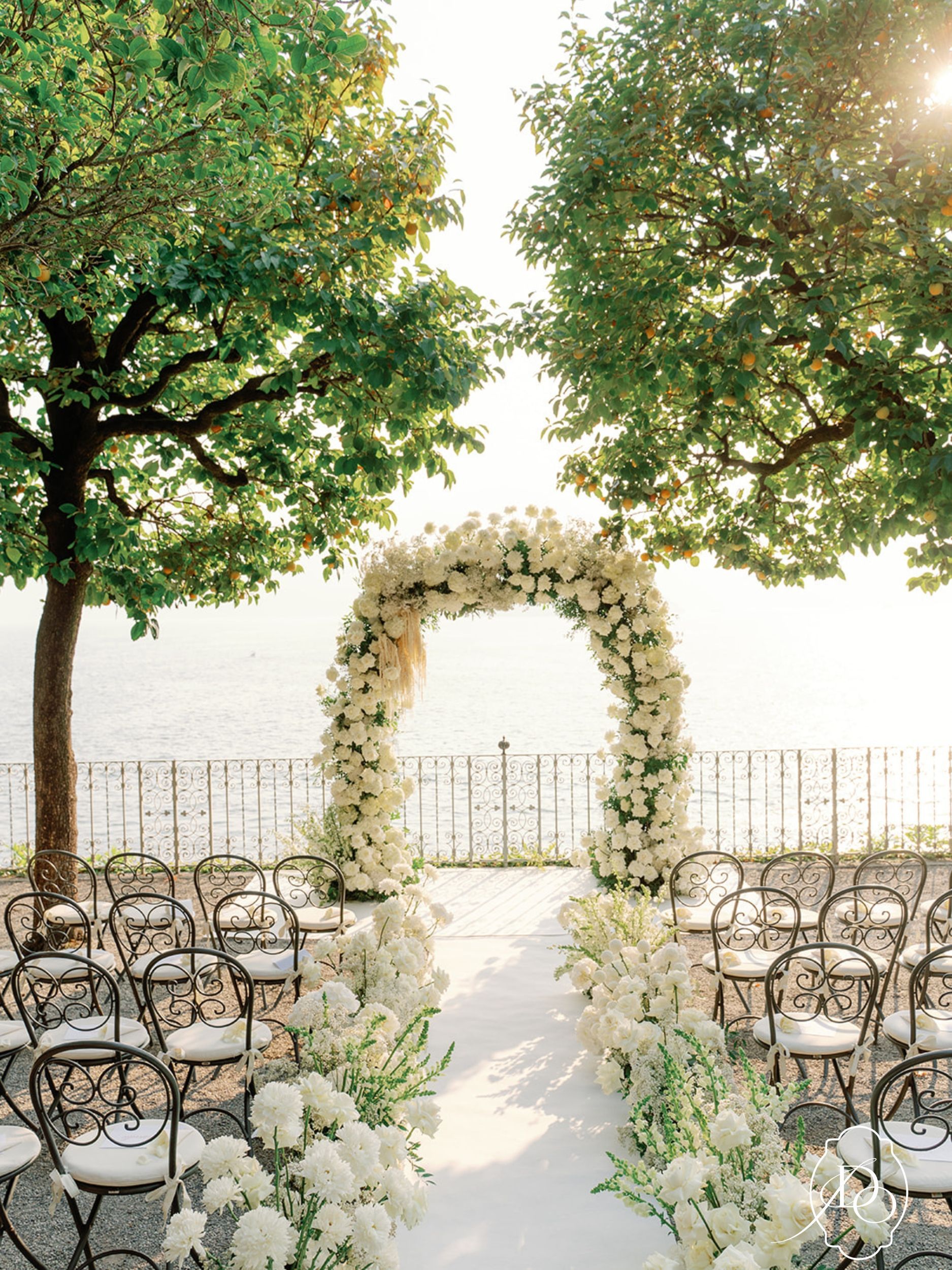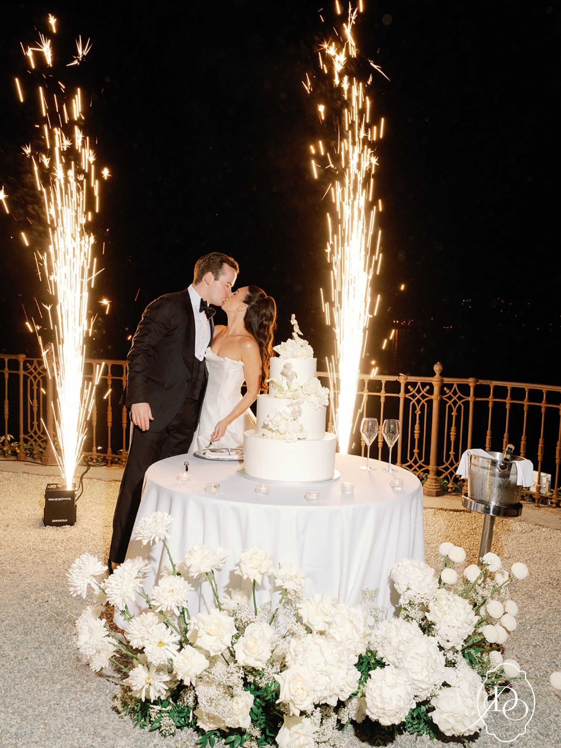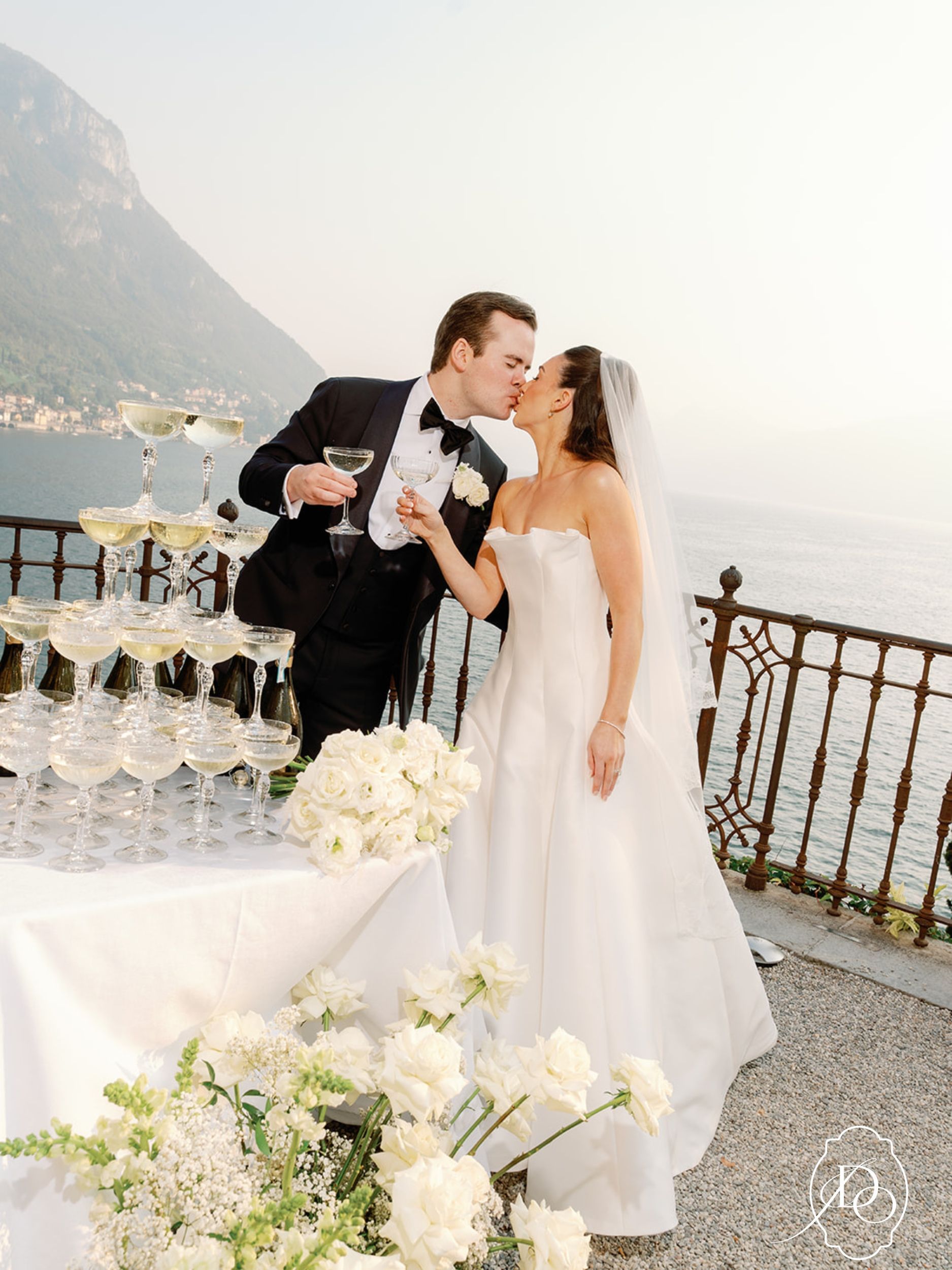 The reception followed on the enchanting outdoor terrace of Villa Cipressi, surrounded by greenery with a stunning view of the sunset over the lake. The refined and elegant decor was composed of delicate white flowers and crystal chandeliers with light blue candles. To the smooth sounds of a saxophone, guests enjoyed a refined dinner before joining the dance floor for a night of joy and fun.