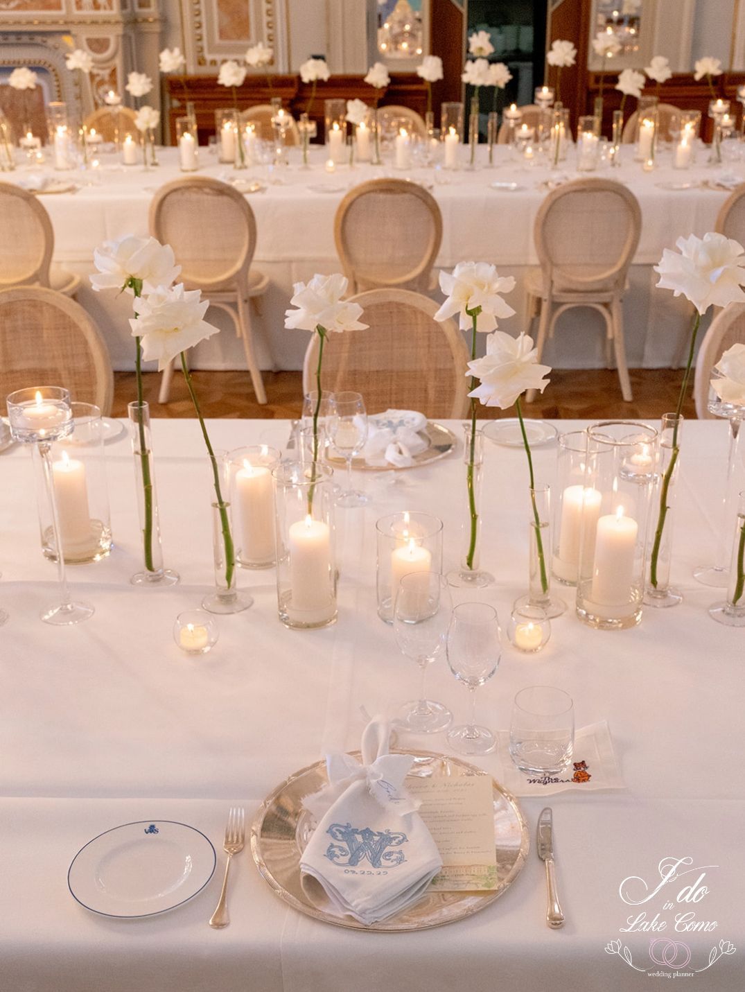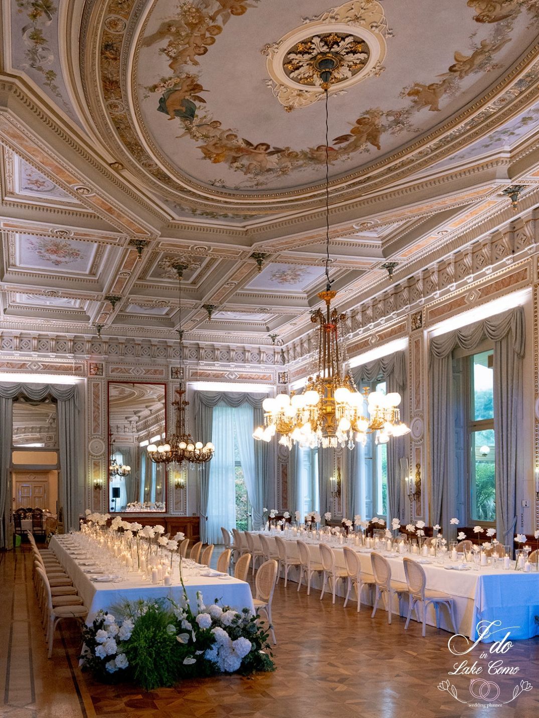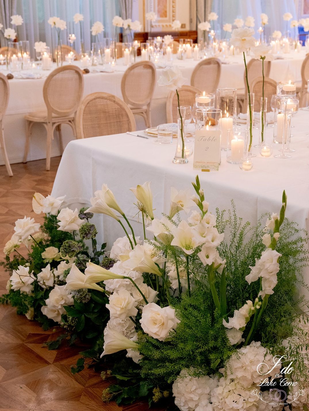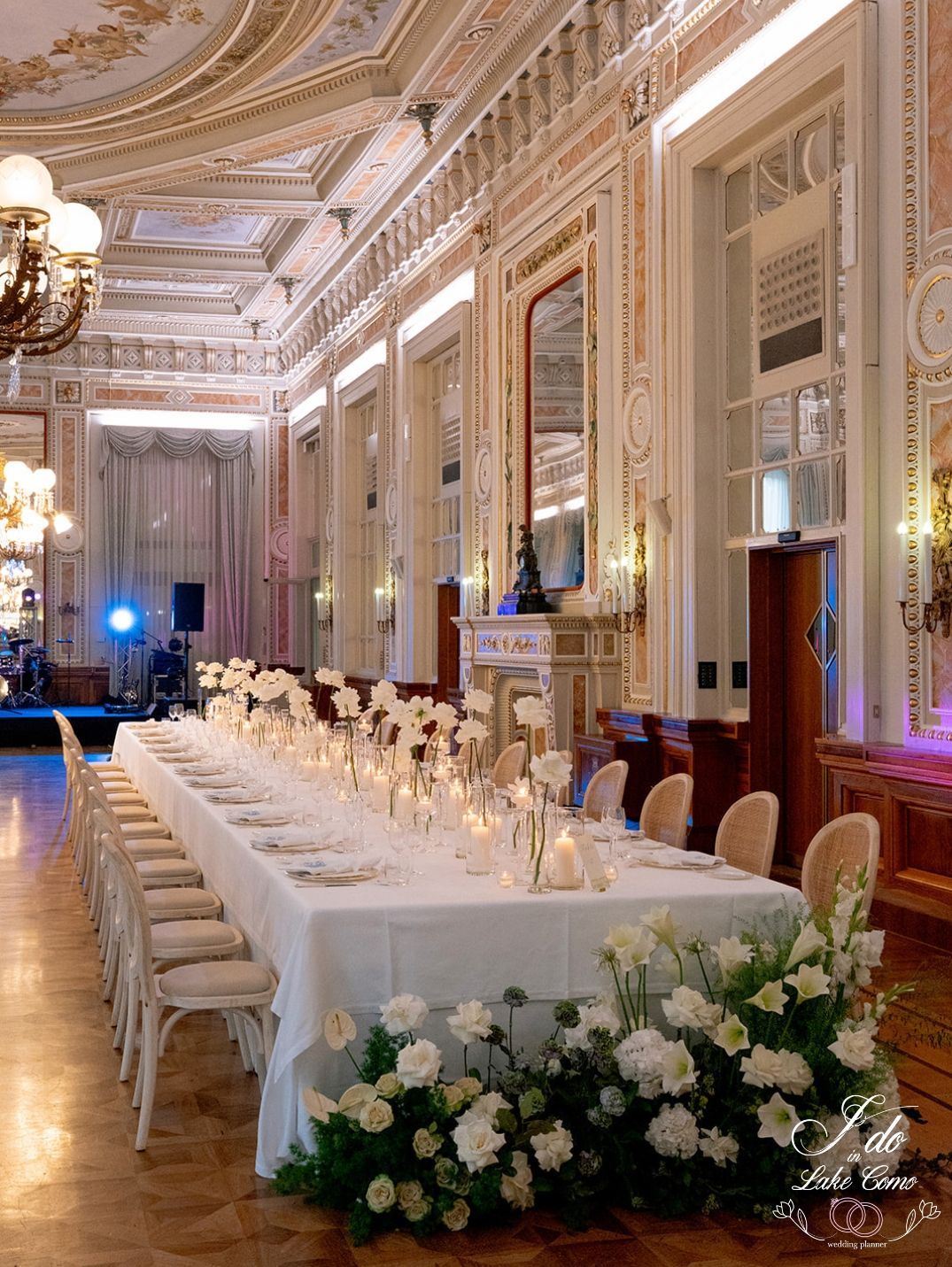 The dinner took place in a room radiating classic Italian elegance, where intricate frescoed ceilings, sparkling chandeliers, and gilded details created a truly breathtaking setting. White flowers and flickering candles added an extra layer of romance and luxury, perfectly complementing the old-world charm. Long tables were beautifully set, offering the finest Italian cuisine to delight every guest. The celebration was crowned by a stunning three-tiered white cake, followed by a lively and joyous party where everyone came together to celebrate love late into the night.