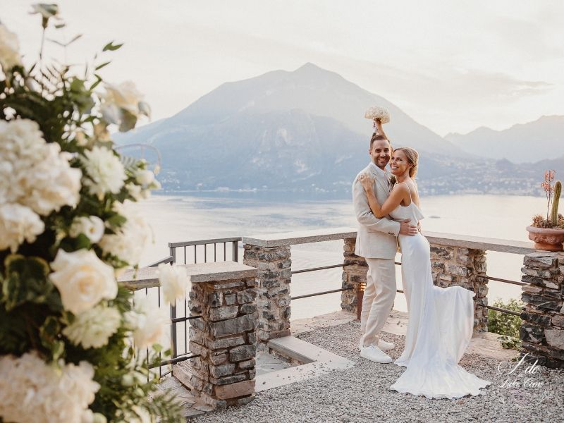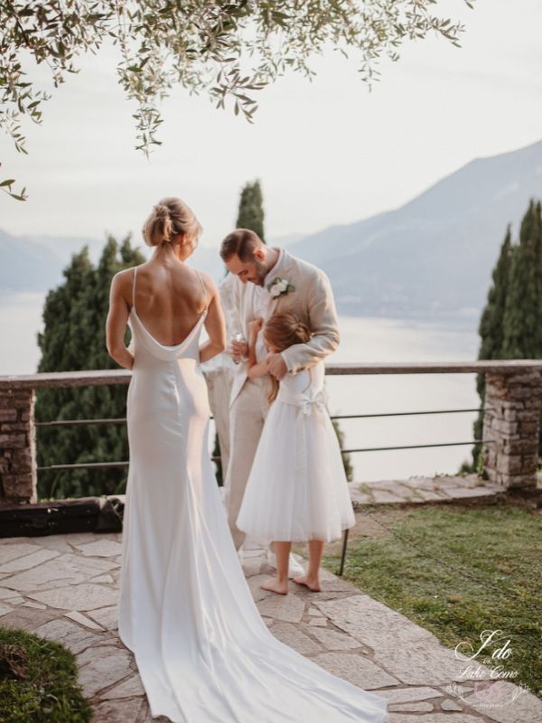 The ceremony took place on the beautiful and evocative terrace of the Castle, where the view is breathtaking. The magnificent olive tree was adorned with luxurious chandeliers, and the couple was framed by a grand arch of white flowers. The ceremony was undoubtedly a very moving moment, thanks to the presence of the two children who shared this important life milestone with their parents.