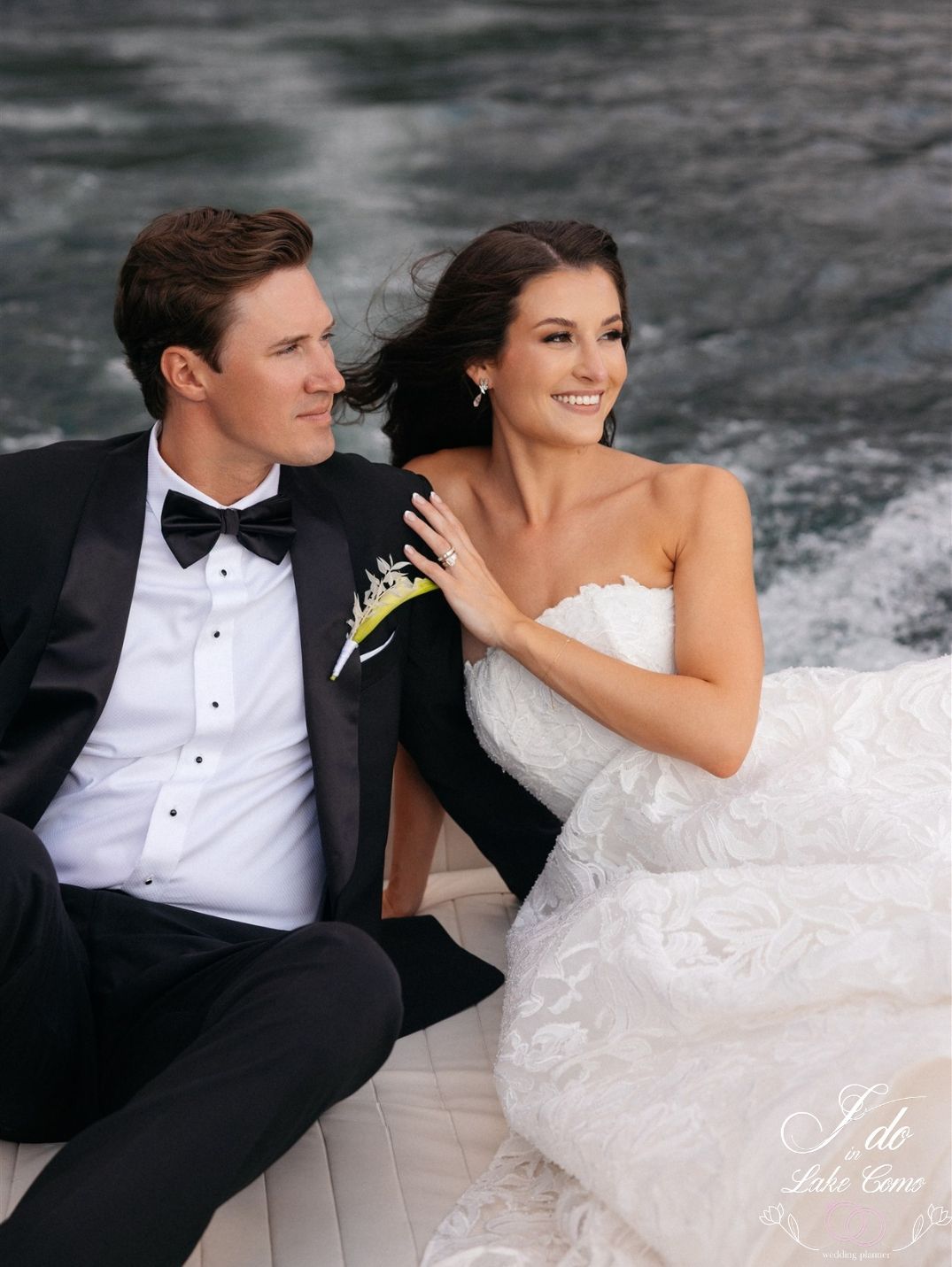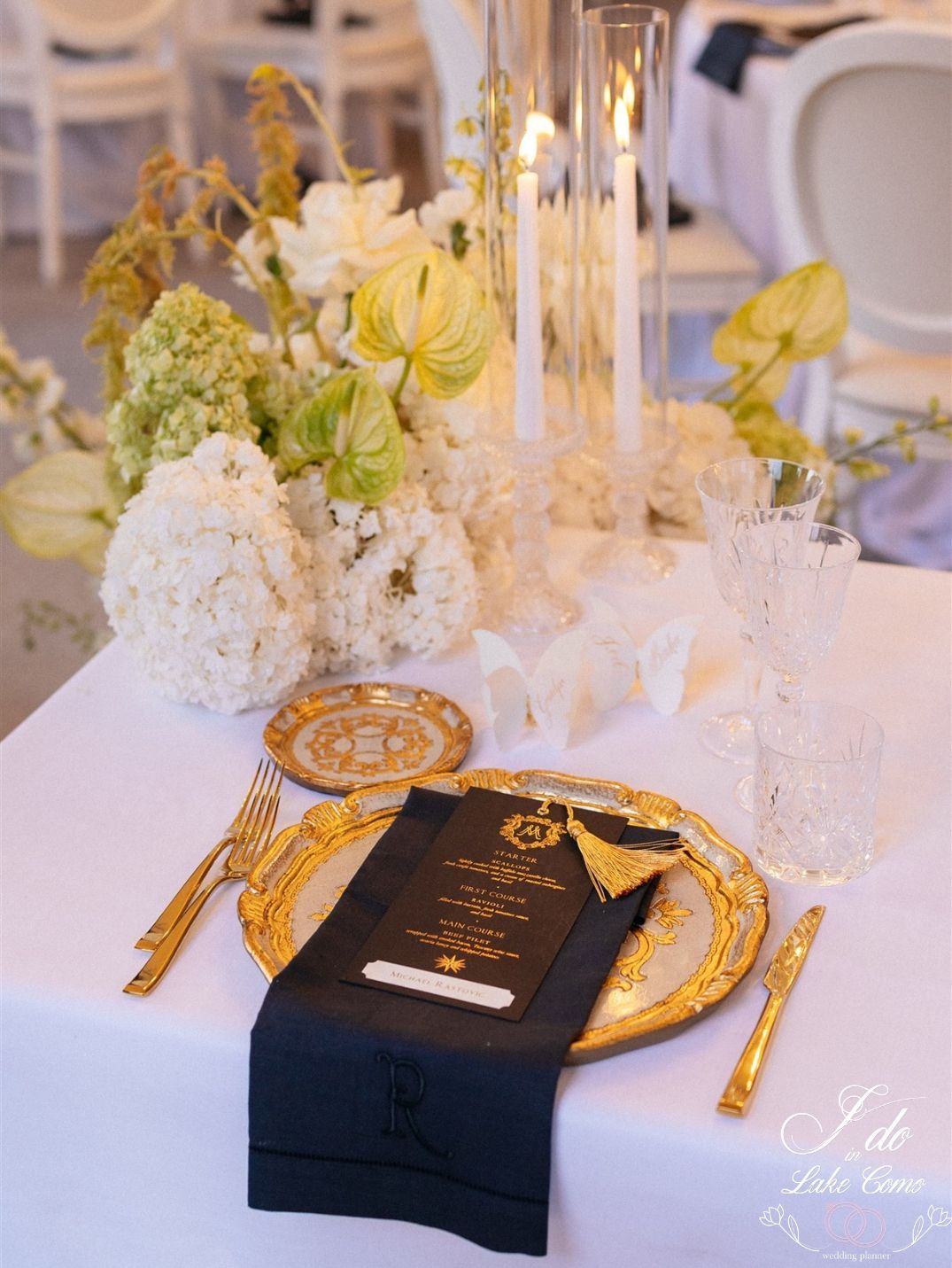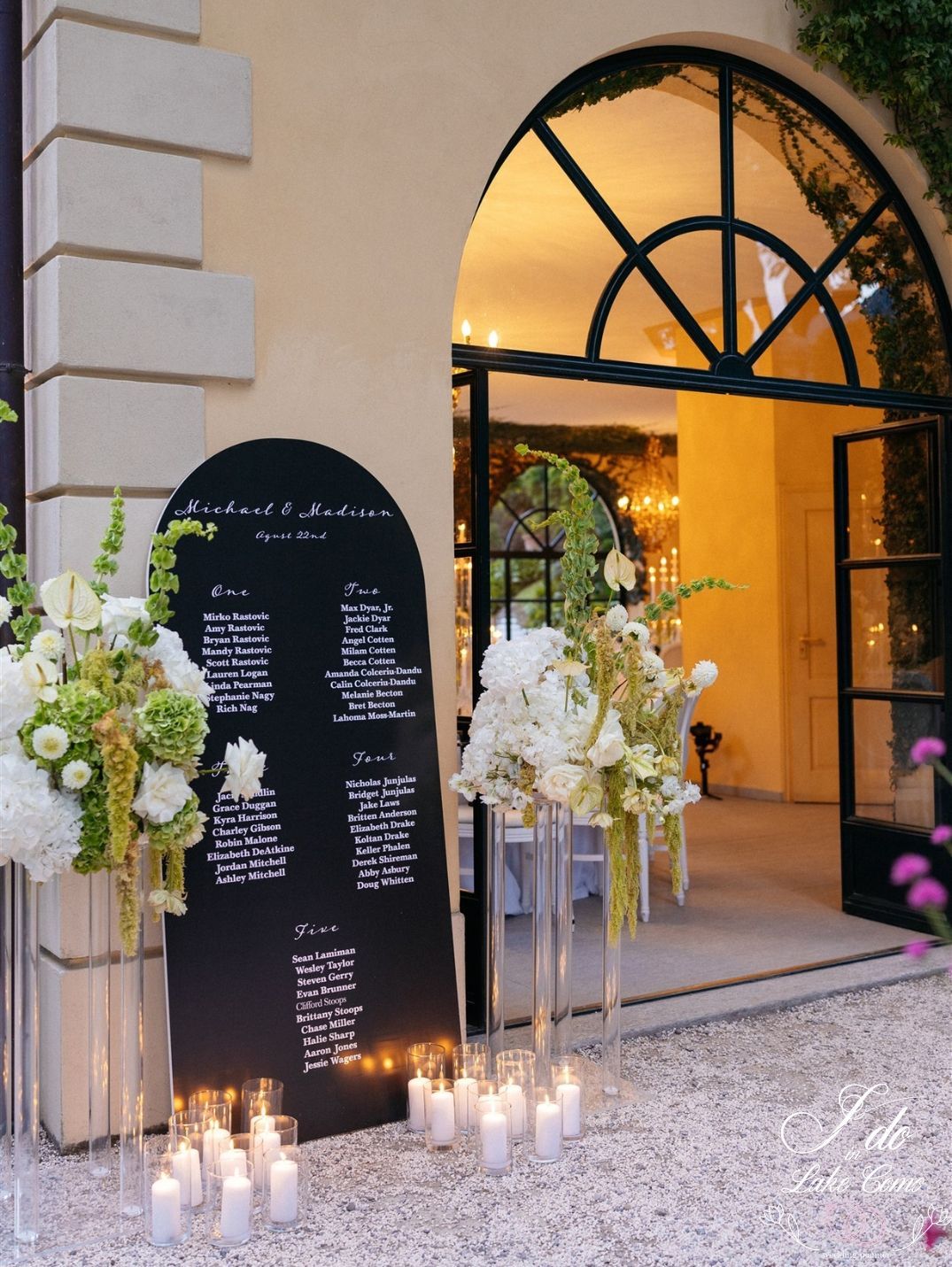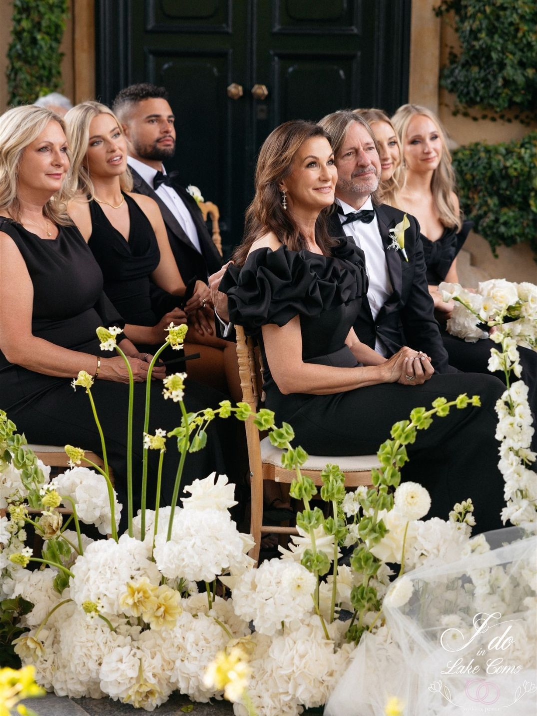 Guests were dressed in an elegant black dress code, which perfectly complemented the historical charm of the villa. After the ceremony, Madison & Michael took a romantic boat ride across the lake, capturing beautiful memories with unforgettable photos, while guests enjoyed an aperitivo accompanied by a graceful string duo.