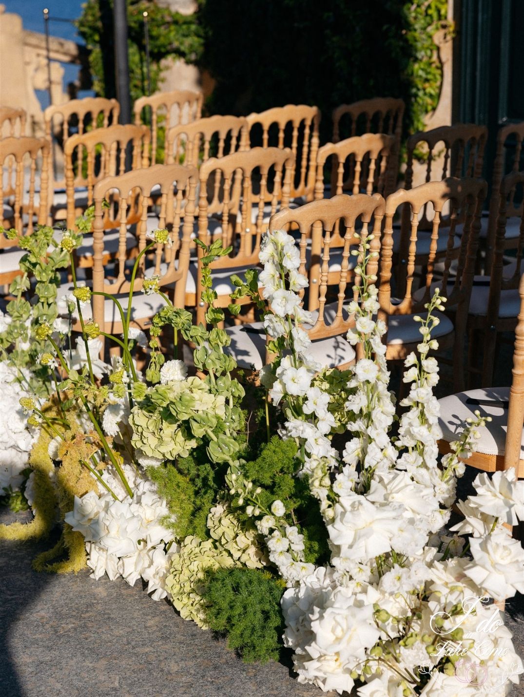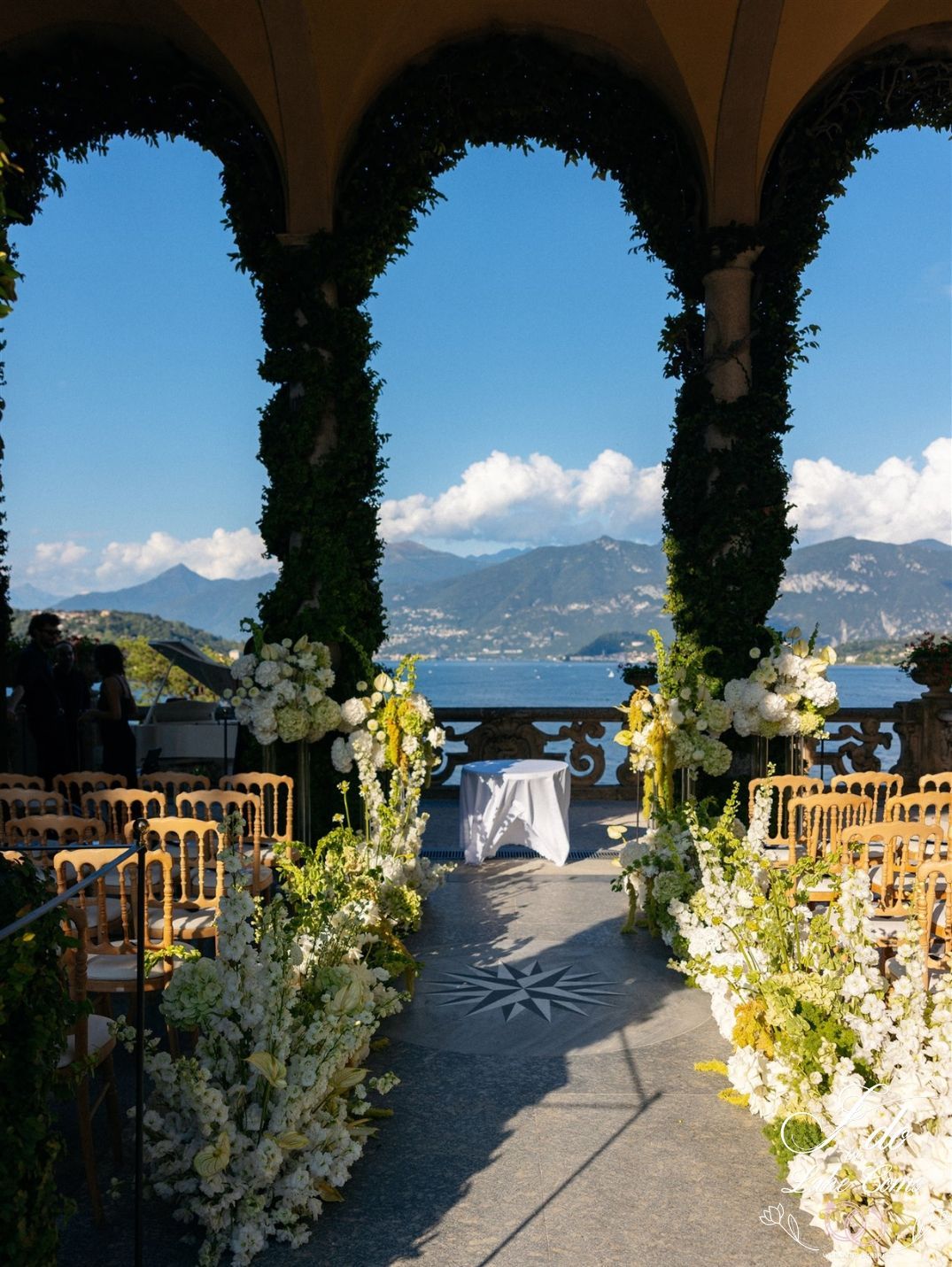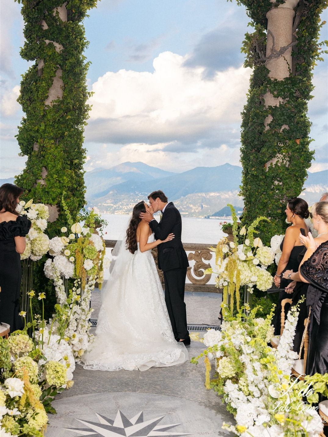 As is tradition, guests arrived by boat, setting the tone for the magical day ahead. A soft piano melody filled the air as Madison made her entrance with her father, and the ceremony began beneath the villa’s iconic three-arched loggia — a breathtaking spot to exchange heartfelt vows.