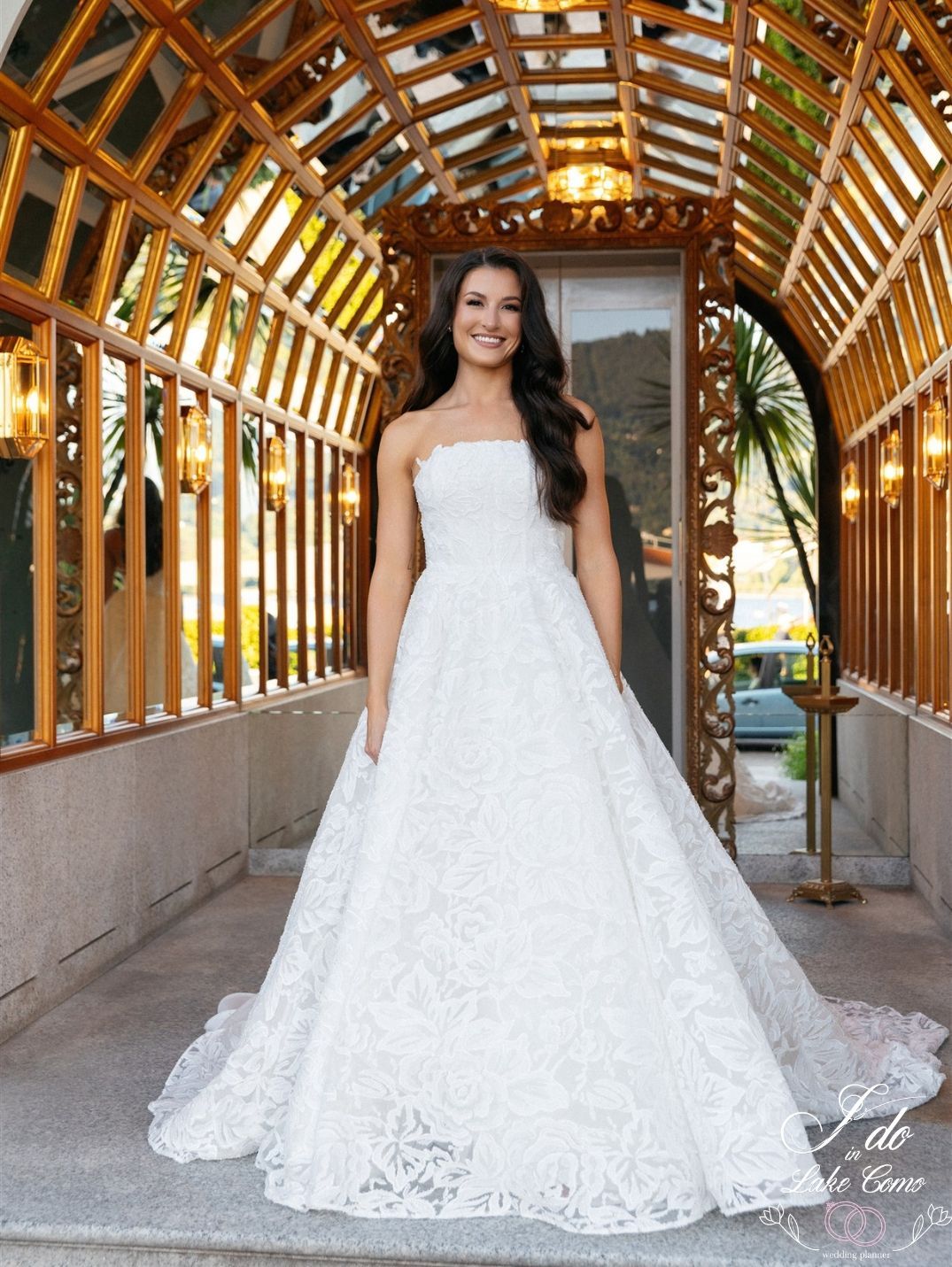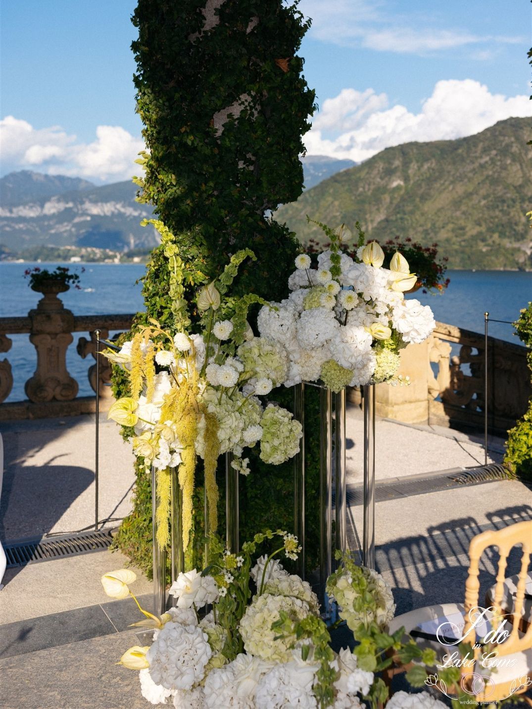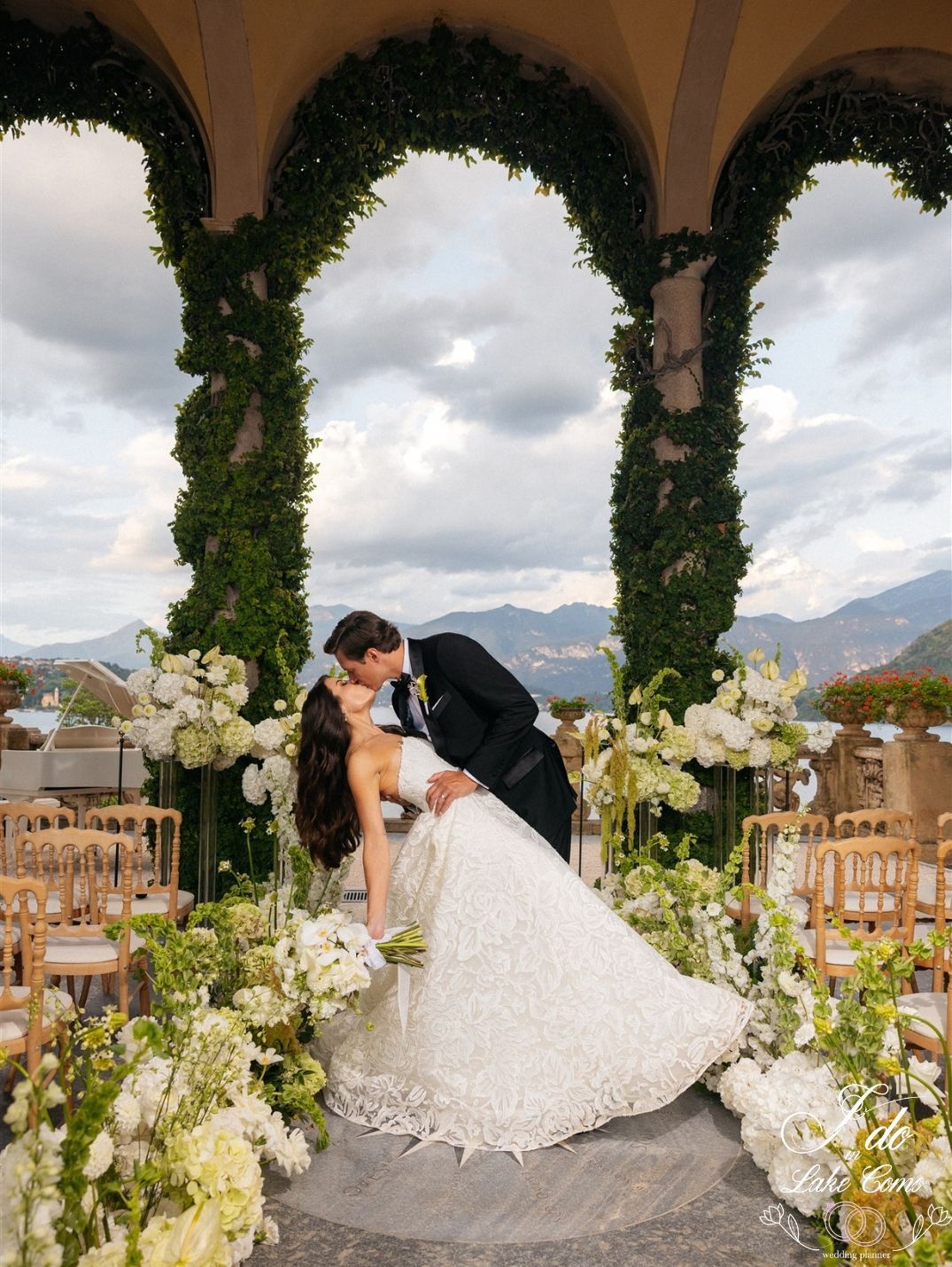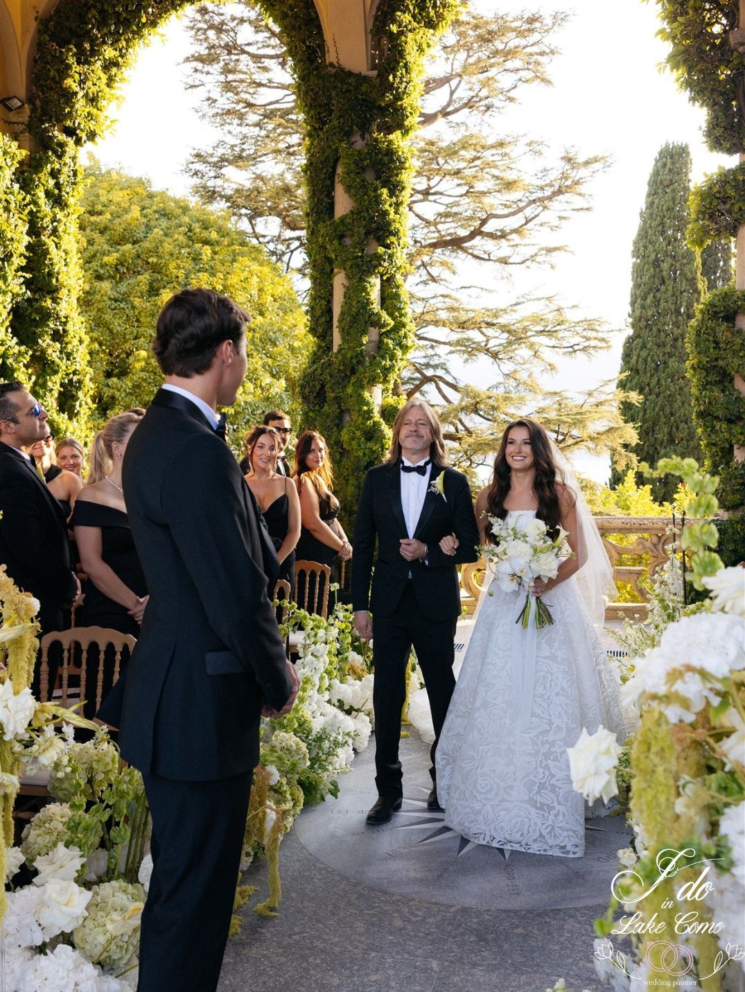 The ceremony took place beneath the iconic three-arched loggia of Villa del Balbianello, overlooking the sparkling waters of Lake Como. The space was beautifully decorated with white and green floral arrangements that brought the entire setting to life, making it feel like the most enchanting garden. As a soft piano melody played, guests watched Madison walk in with her father, setting the tone for a deeply emotional and unforgettable exchange of vows.