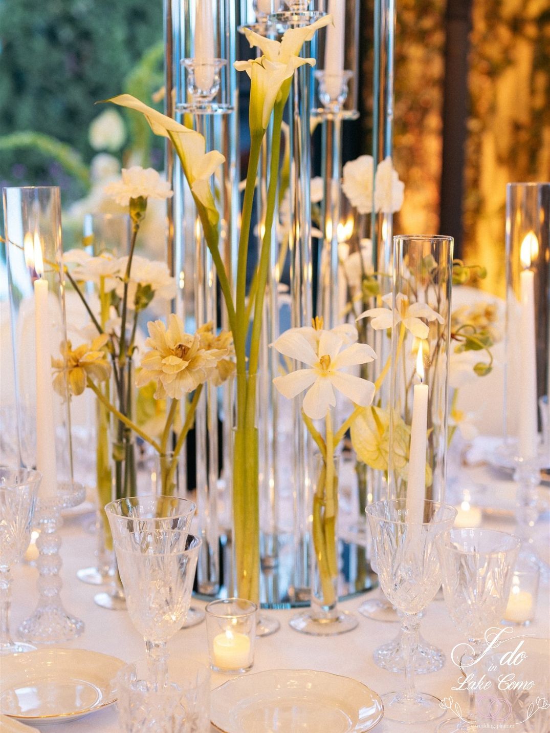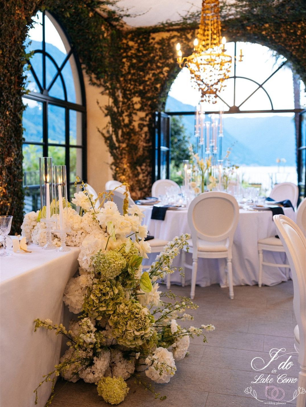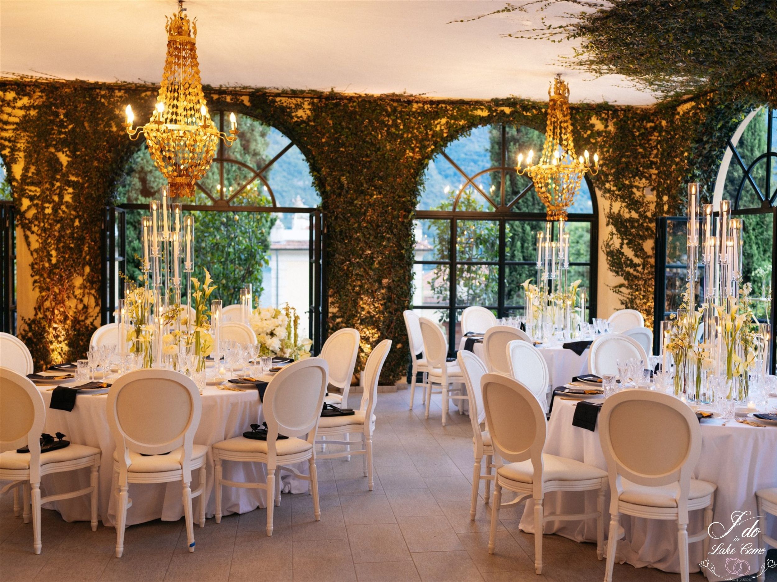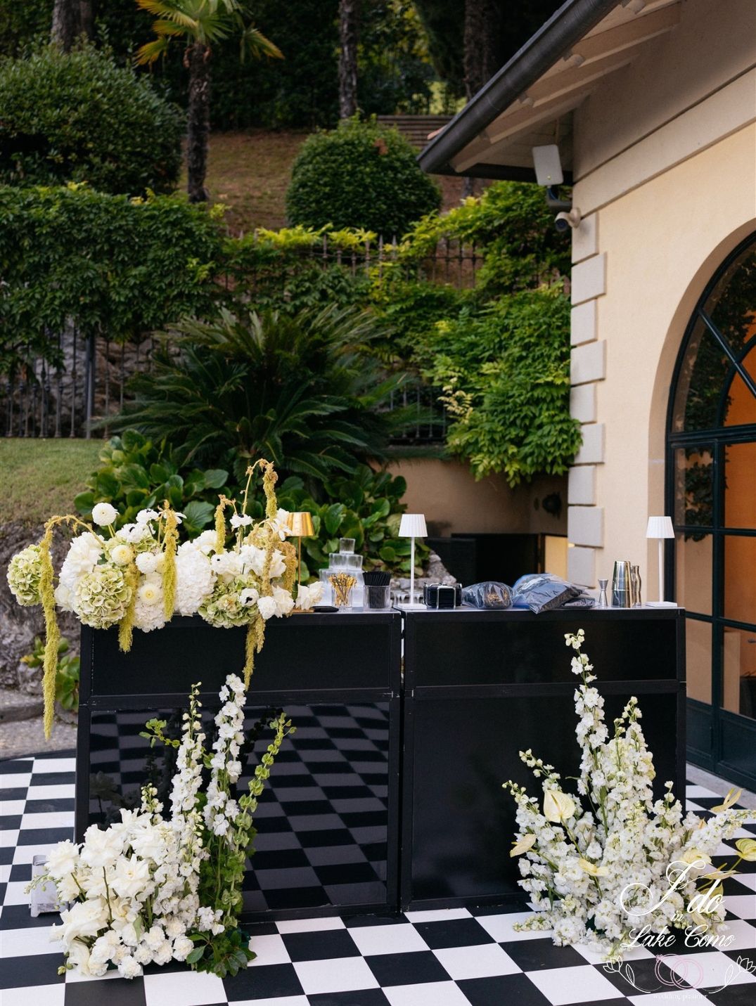 Dinner was held in the stunning Loggia Segre, where round tables were elegantly set with gold-accented tableware, black napkins, and centerpieces of white and green floral arrangements paired with glowing white candles. The sophisticated decor perfectly complemented the villa’s timeless charm. Guests enjoyed the finest Italian cuisine alongside a stylish cocktail bar serving signature drinks throughout the evening. The wonderful views of Lake Como, surrounding mountains, and the villa’s beautiful gardens created an unforgettable and elegant atmosphere for the celebration.